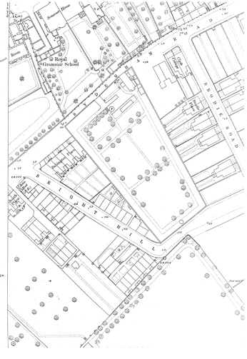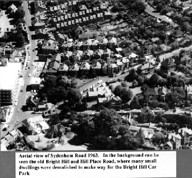 The original Bright hill, leading from Sydenham Road up to Harvey Road, was extremely steep. In creating the car park in the late 60s the engineers joined Bright Hill with Hill Place – a cul de sac with which it ran parallel – forming a gentler slope. Some 80 small dwellings were demolished in the process. The retaining wall of the end of Hill Place can be seen – about halfway up Bright Hill. At the bottom were some shops – a newsagent, butcher, fish and chips, a grocer and Mr J. Klein – a Jewish Tailor.