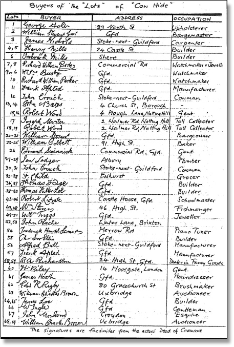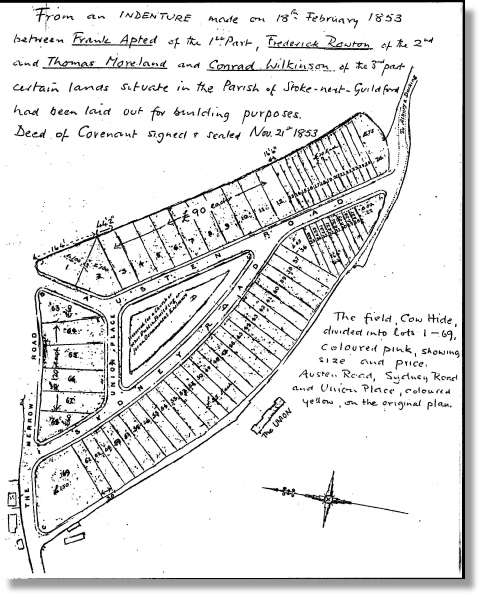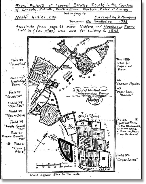 The Farm was quite easily found. It turned up in a book of ‘Plans of Several Estates’. In this a whole page is devoted to a plan of Watford & Woodbridge Farms in 1789. If you look at the accompanying plan you can see where the two farmhouses were and notice that the field called ‘Cowhide’ is the exact shape of Austen/Sydney Rd. area between Warren Rd. (then Albury Rd.) and Epsom Rd. (then Merrow Rd.). What is even more satisfying is that Watford Farm is still there at the end of Watford Close, off Cranley Rd. I was fortunate enough to find Mr Marshall, a builder who had lived in the house and had converted it into flats; he showed me where the original internal structure is still evident.